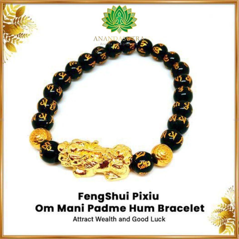 Elegant bracelet featuring Feng Shui Pixiu and Om Mani Padme Hum symbols for abundance, protection, and spiritual harmony.