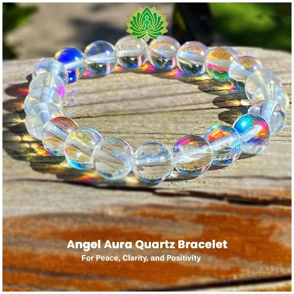 Gorgeous bracelet with shimmering Angel Aura Quartz, promoting positivity and spiritual connection in a chic design.
