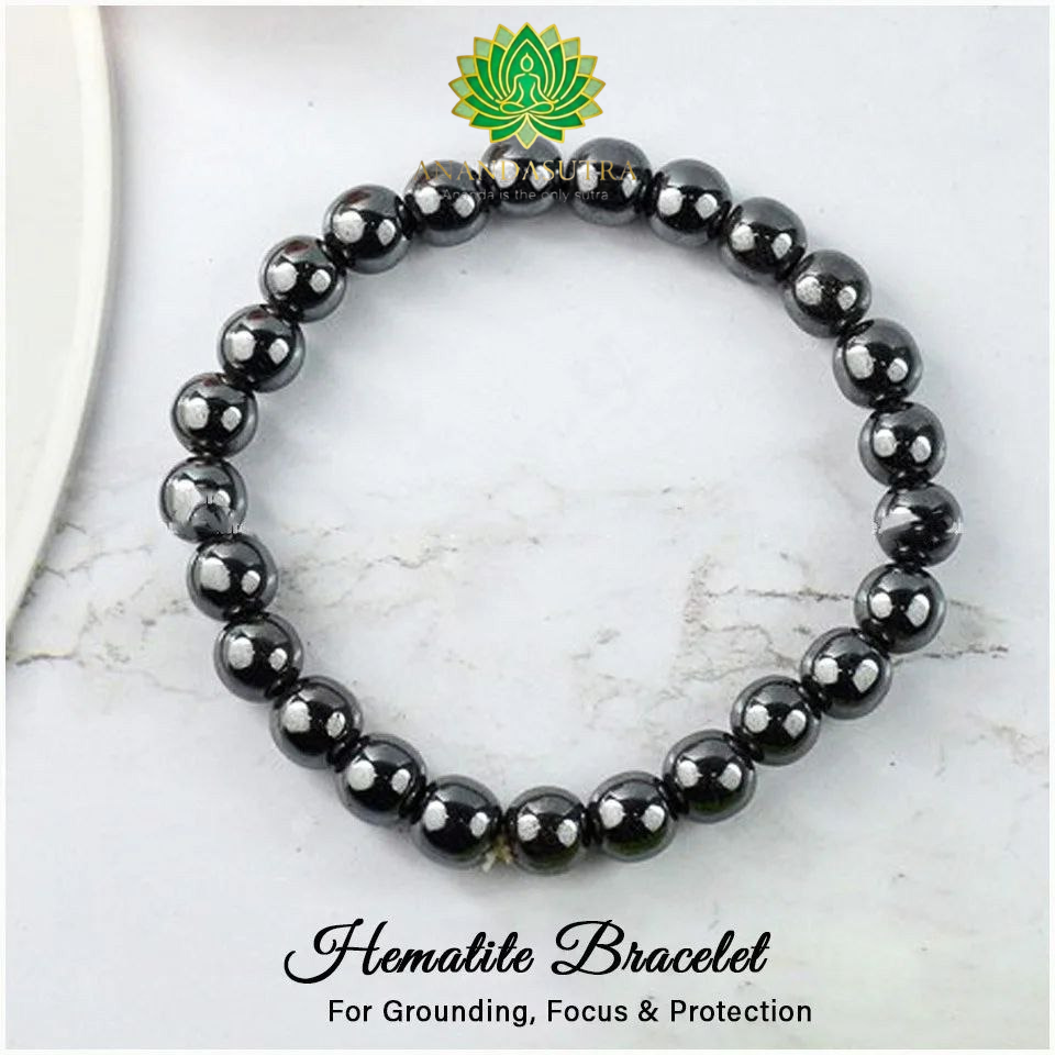 Sleek bracelet with hematite stones, grounding and balancing energy, promoting focus, strength, and protection in everyday life.